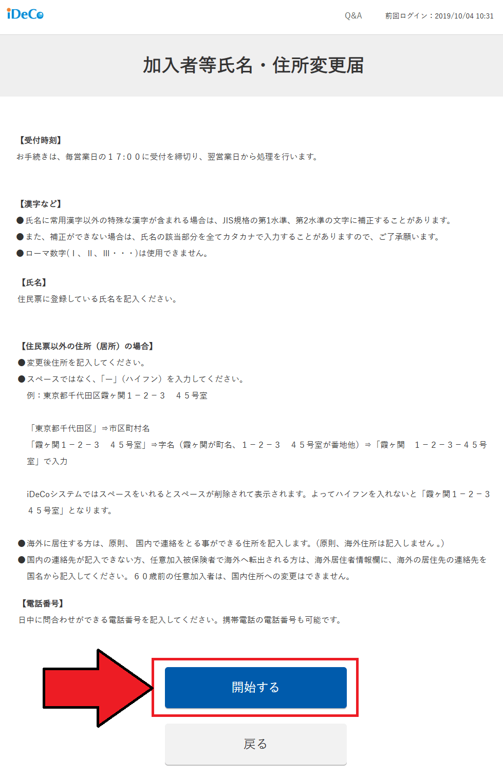 加入者等氏名・住所変更届の注意書きを確認しつつ、「開始する」をクリック