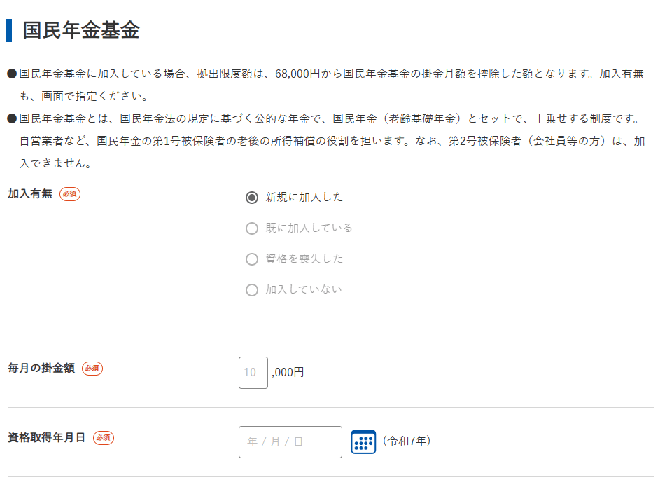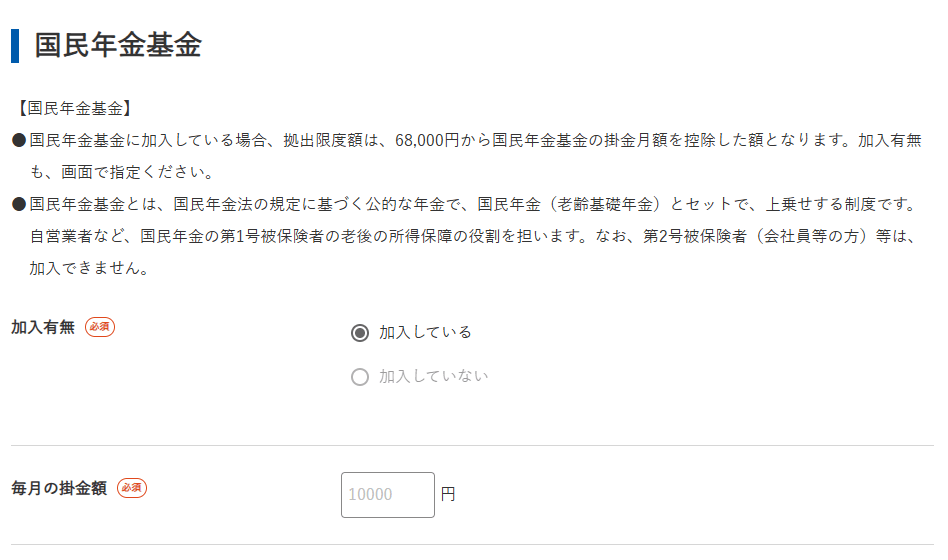 国民年金基金について、加入有無を選択肢、毎月の掛金額を入力する。