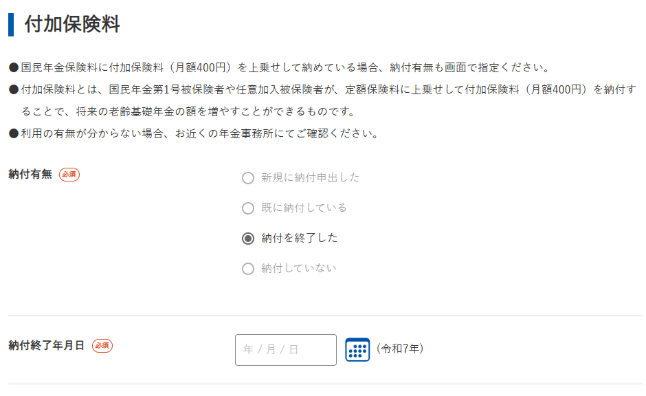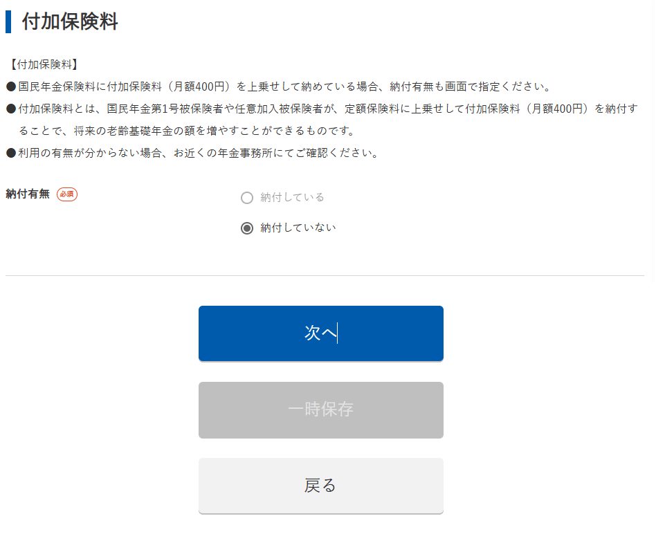 付加保険料について、納付有無を選択し、「次へ」をクリック