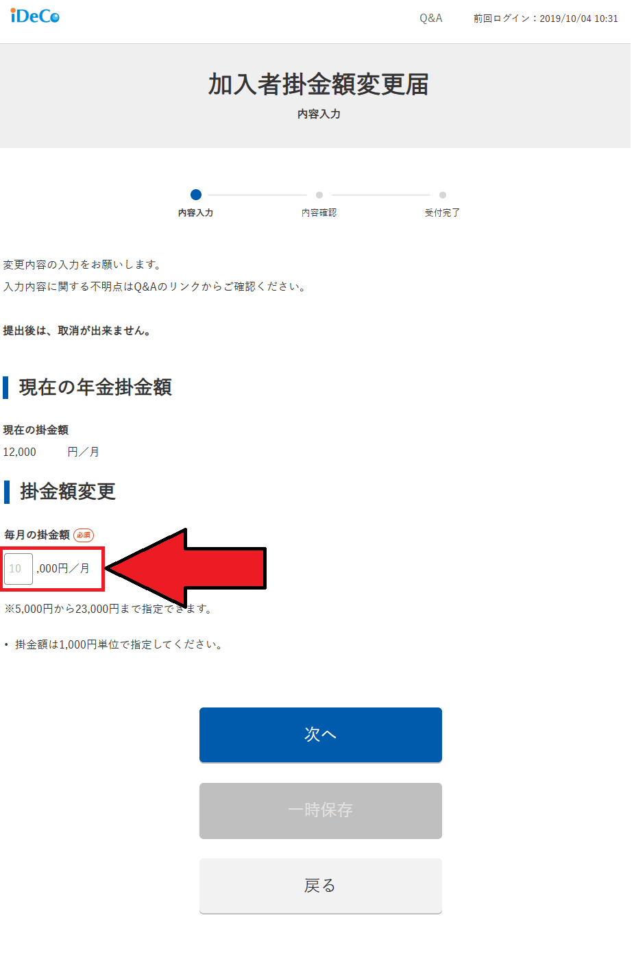 ステップ④:変更後の掛金額を入力して、次へをクリック