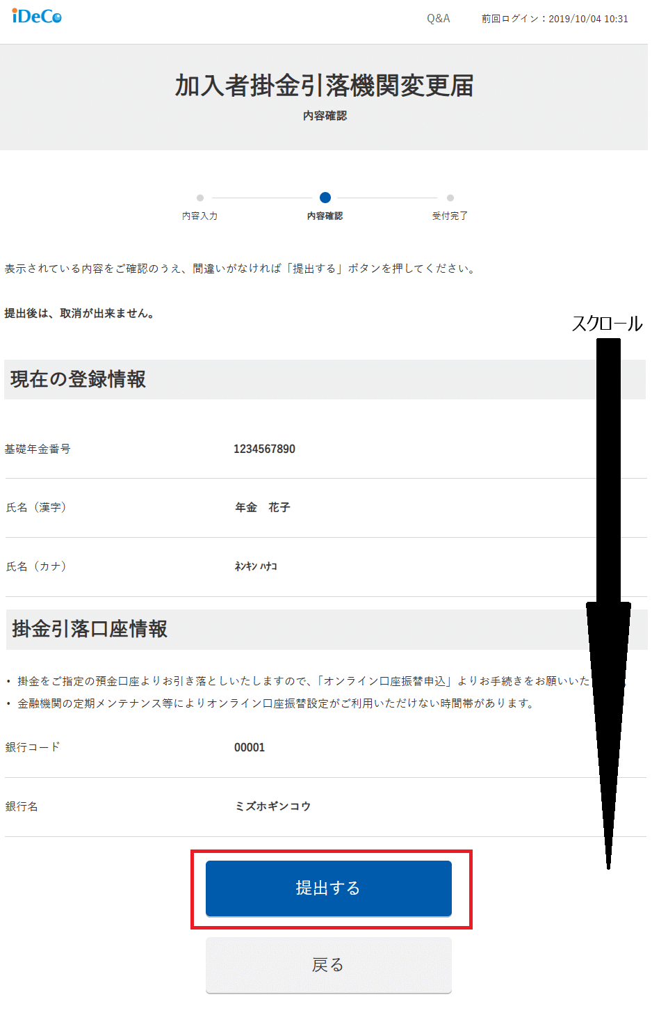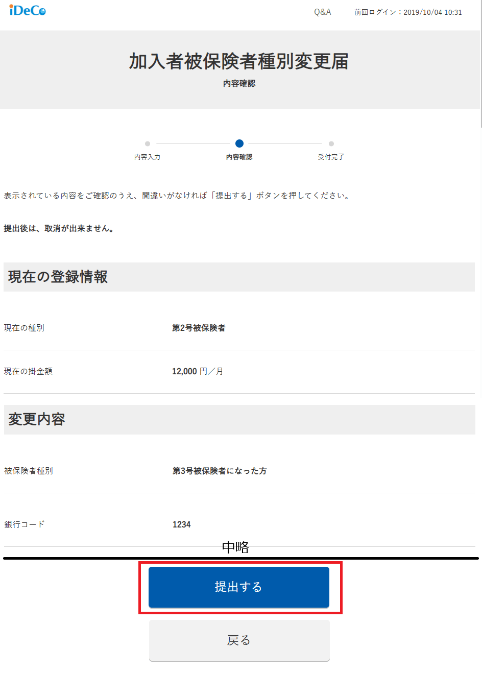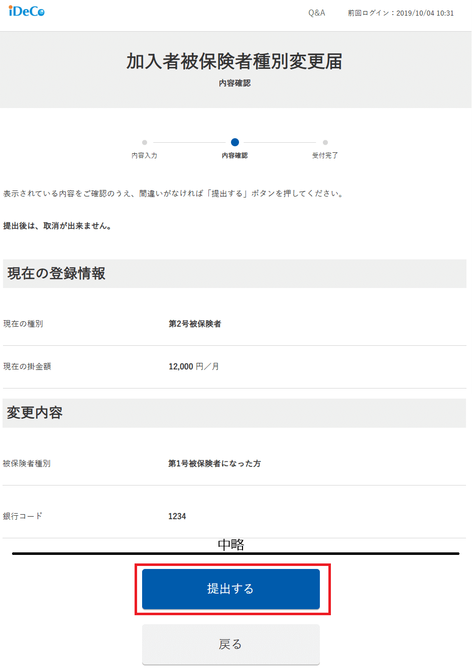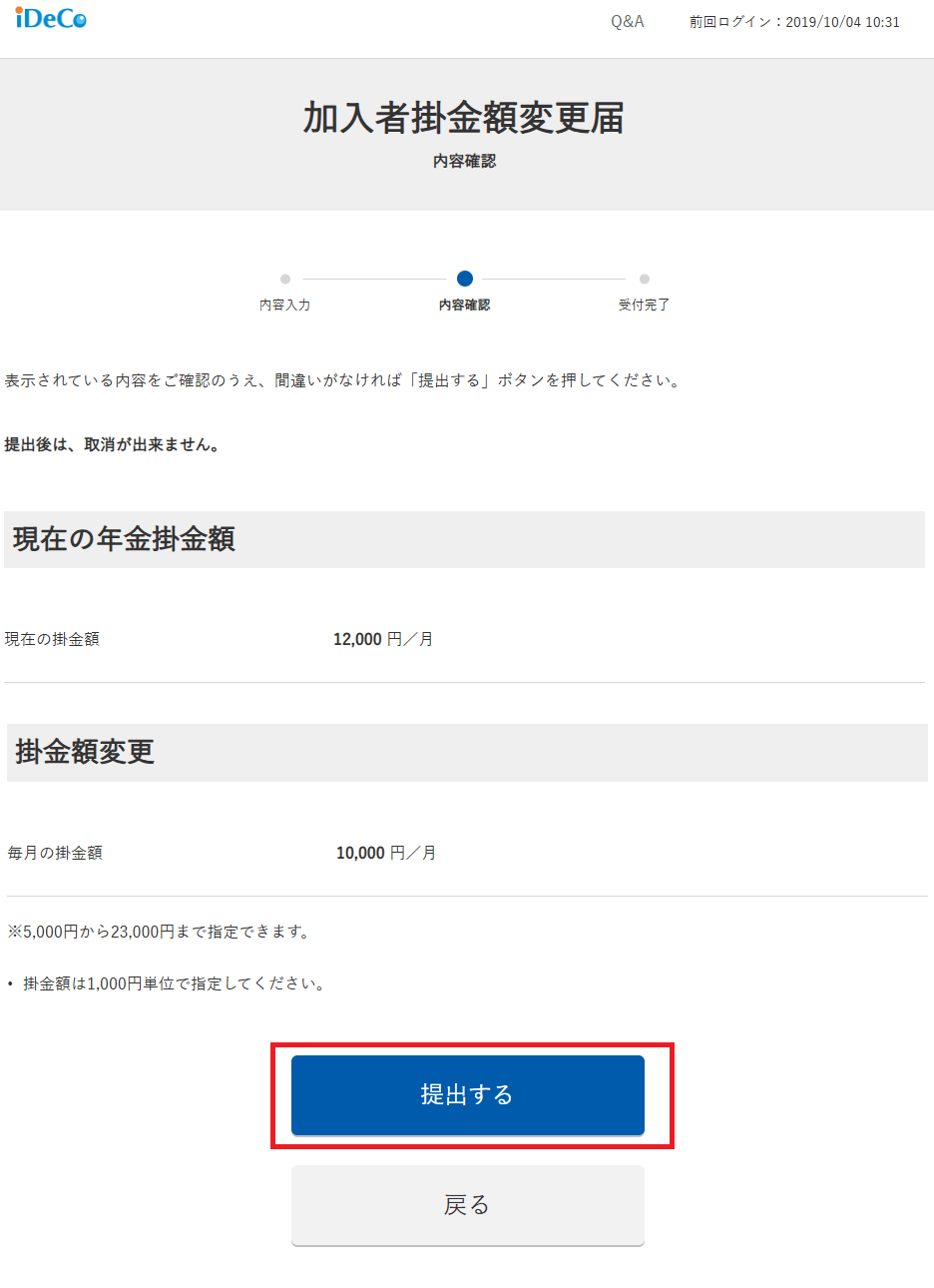 加入者掛金引落機関変更届の内容を確認して、「提出する」をクリック