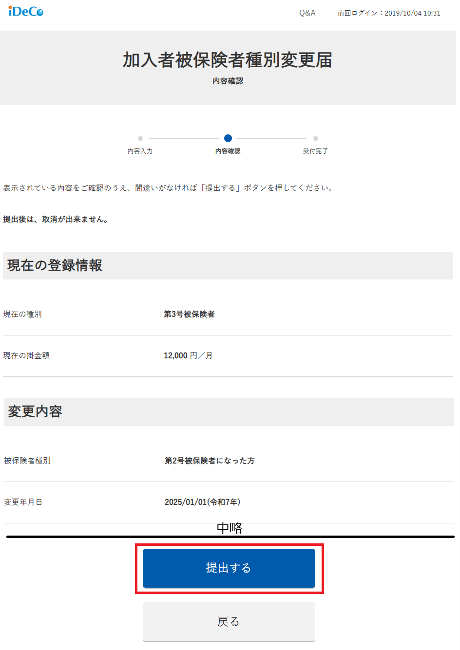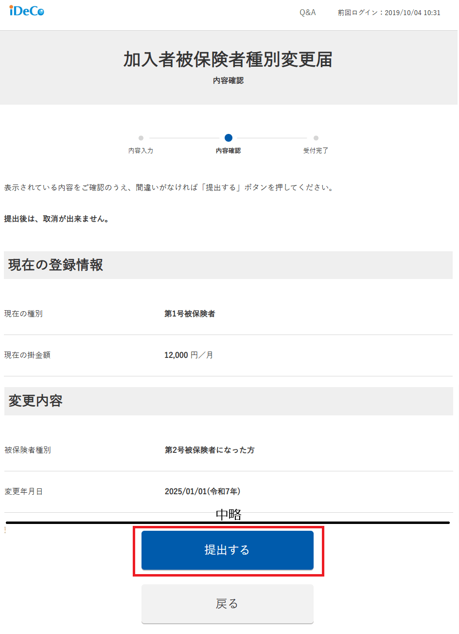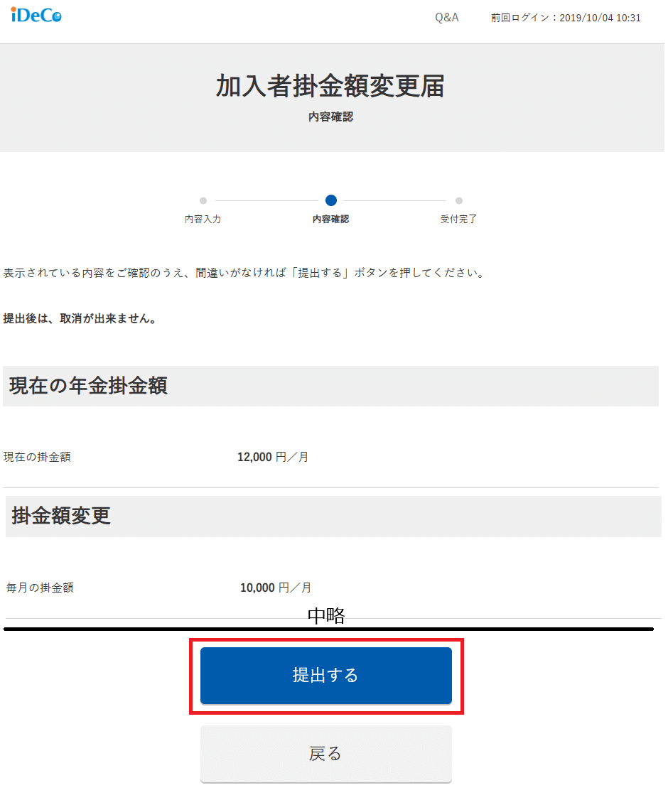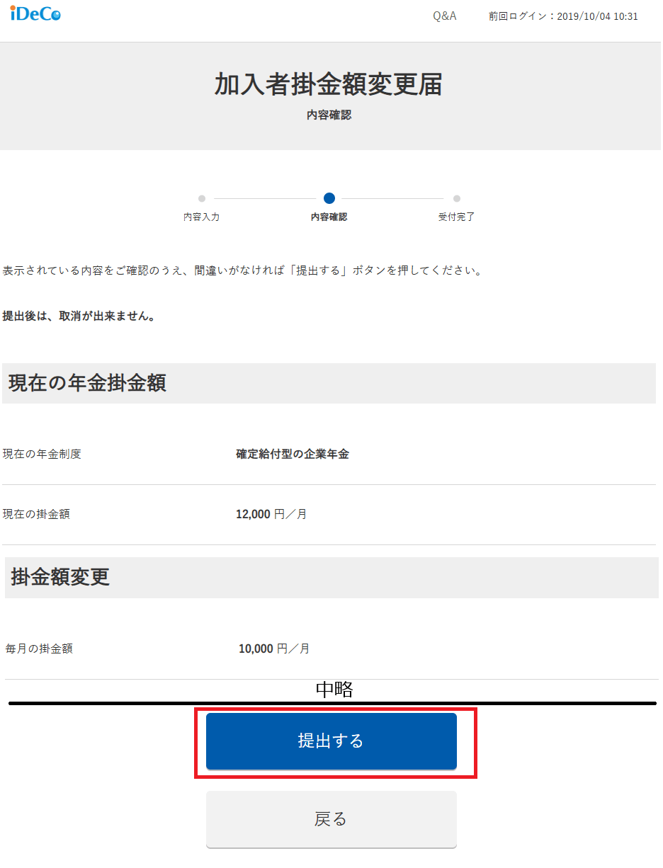 加入者掛金引落機関変更届の内容を確認して、「提出する」をクリック