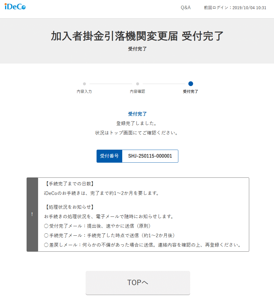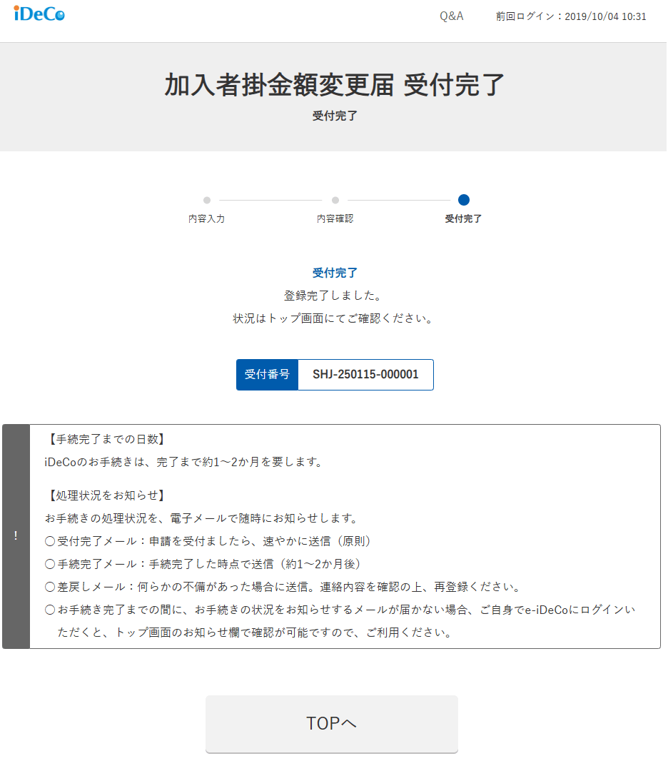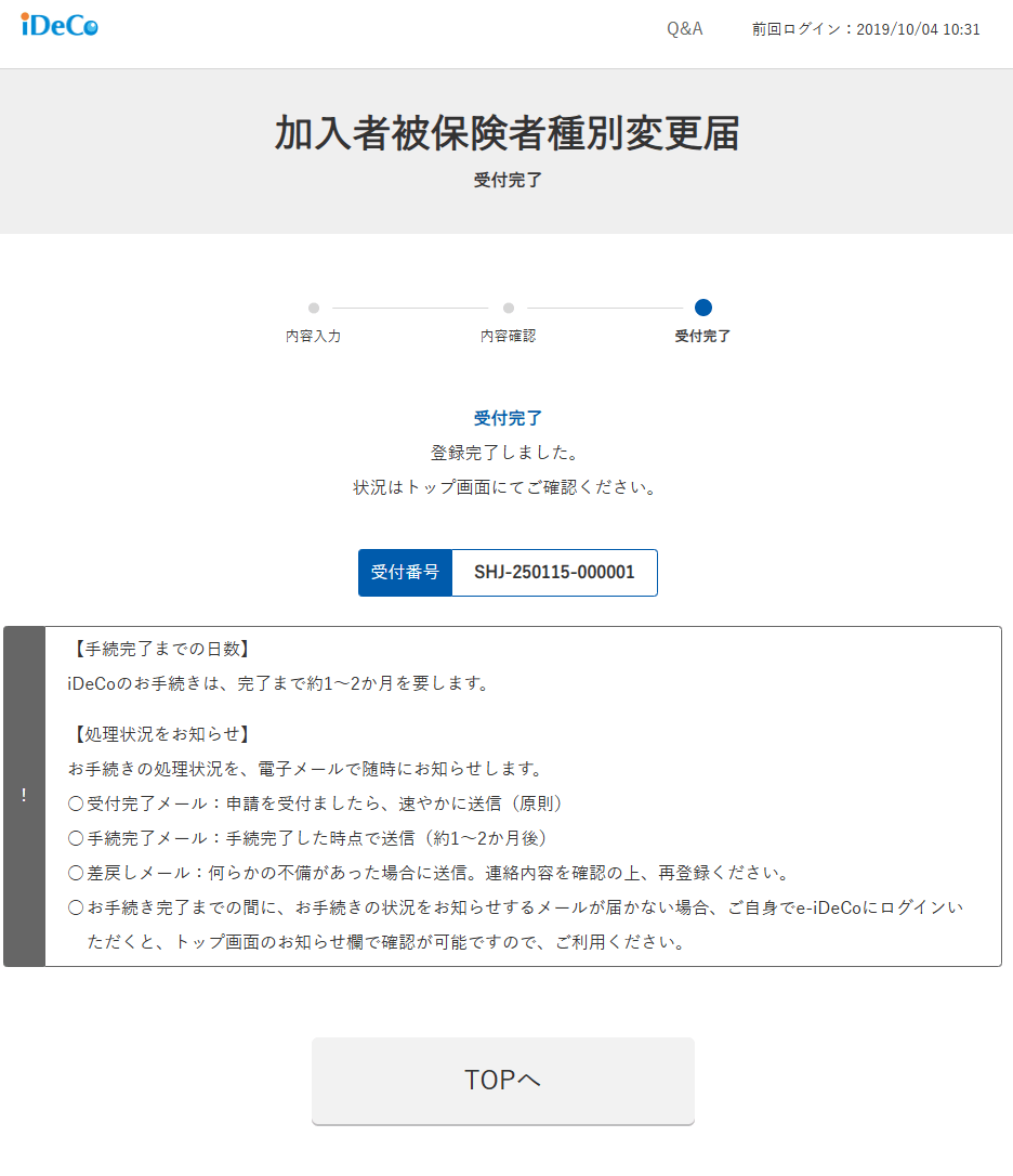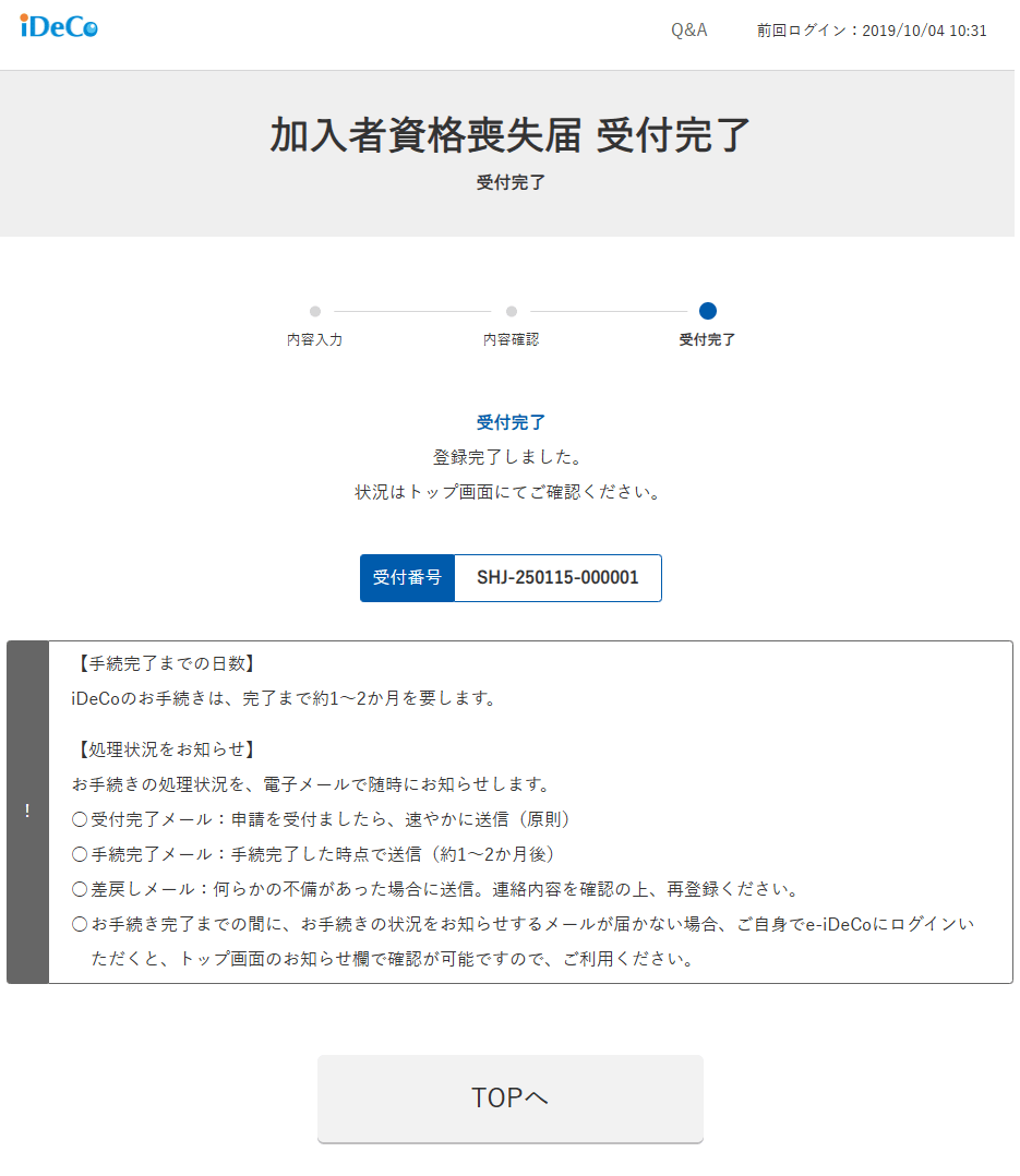 加入者資格喪失届の受付完了メッセージが表示されます。