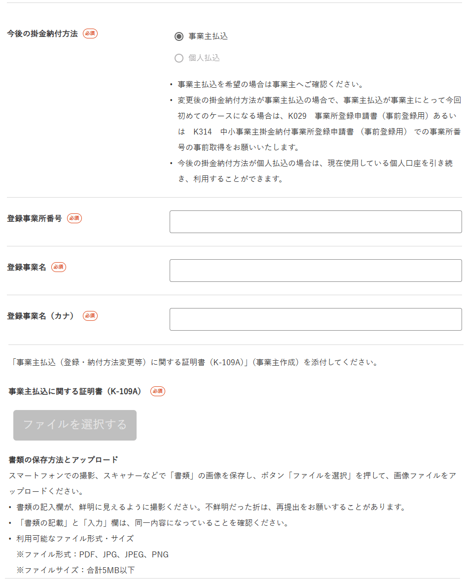 を、勤務先に確認して、入力し、事業主払い込みに関する証明書ファイルを添付します。