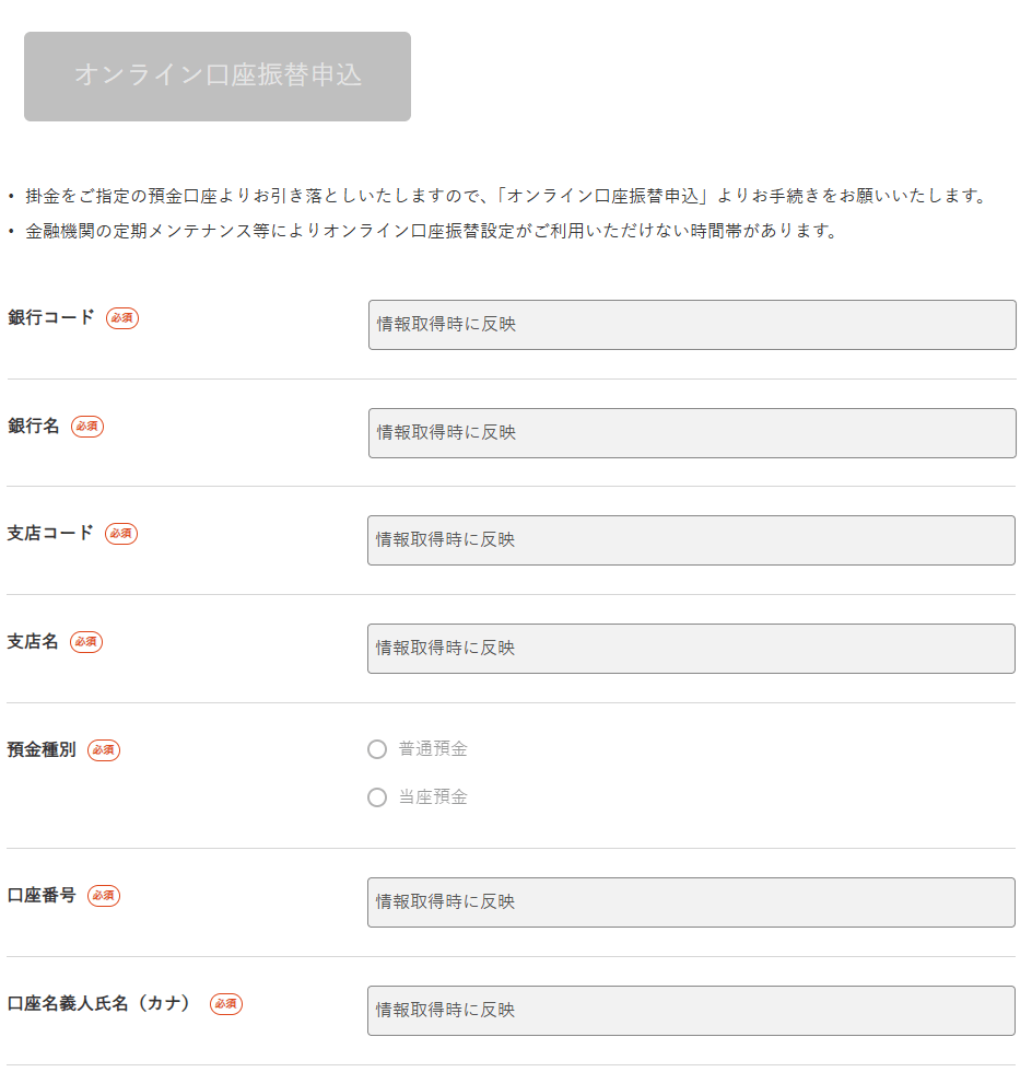 「オンライン口座振替申し込み」をクリックして、掛金を引き落とす口座を設定します。