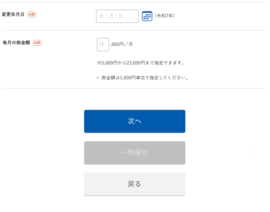 変更年月日を入力し、毎月の掛金額を入力して「次へ」をクリック