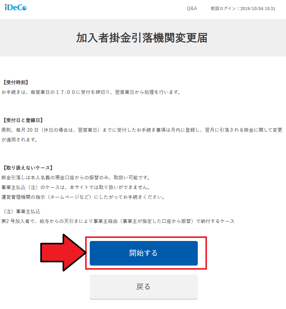 加入者掛金引落機関変更届の手続きで「開始する」をクリック