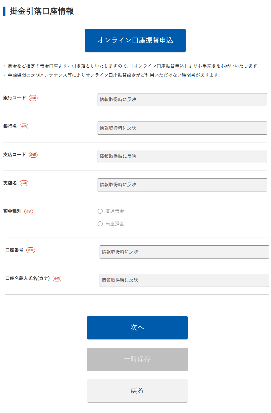 「オンライン口座振替申込」ボタンを押して、掛金引落口座を選択する。