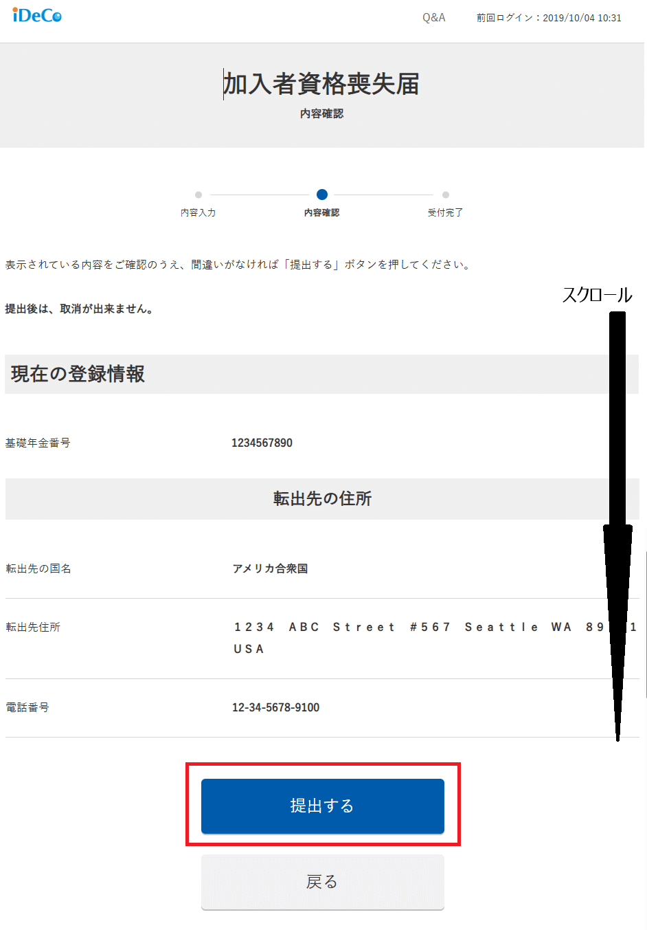 加入者資格喪失届の内容を確認し「提出する」をクリック