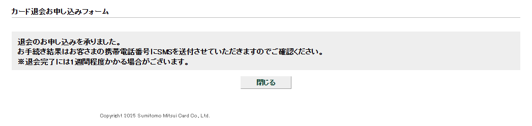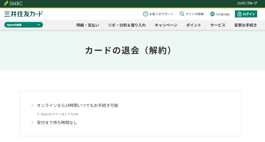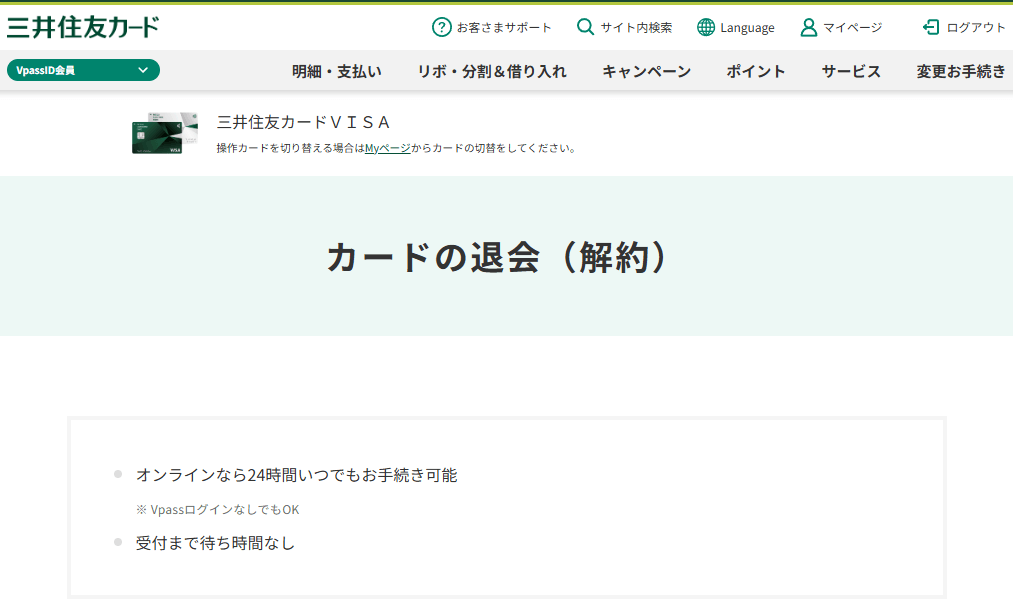 三井住友カードは、Vpassにログインしなくとも、1週間程度後に解約できます。