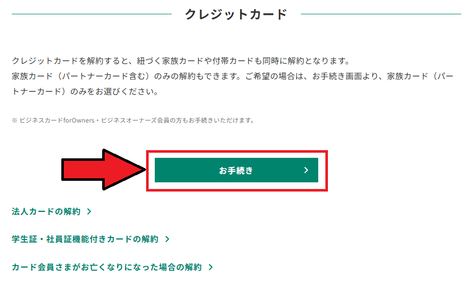 クレジットカードのセクションで「お手続き」ボタンをクリック