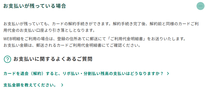 「カードの退会(解約)」画面が表示されますので、下にスクロールしていきます