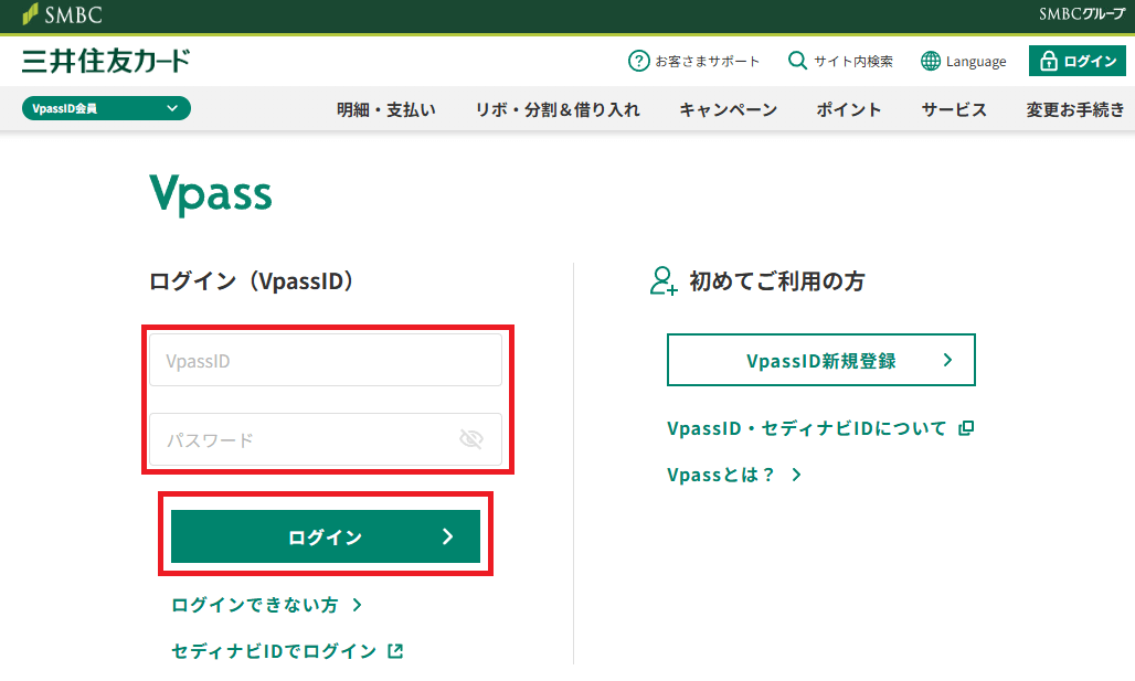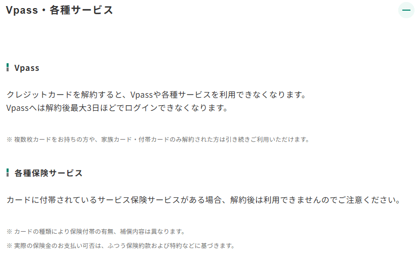「ログインできない方はこちらからお手続きいただけます」リンクから解約手続きを行うと、②:Vpassにログインせず、1週間程度後に解約の方法になります。