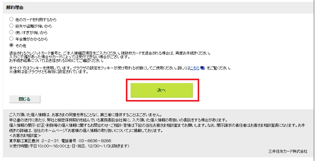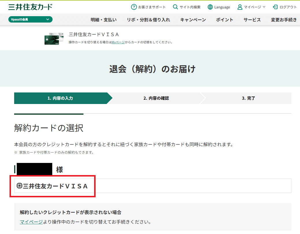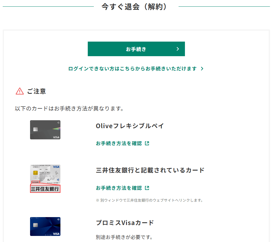 ステップ①:三井住友カードのカード退会ページへアクセス