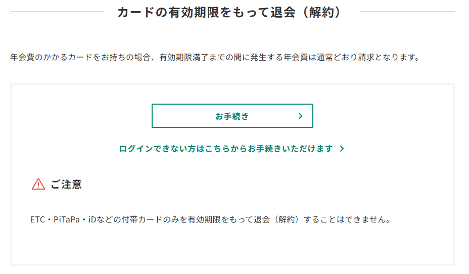 「カードの有効期限を持って退会(解約)」の「お手続き」から退会すると、③:カード有効期限時に、自動解約となります。