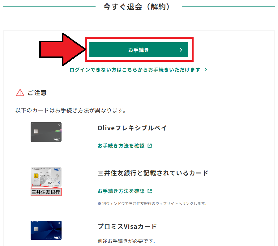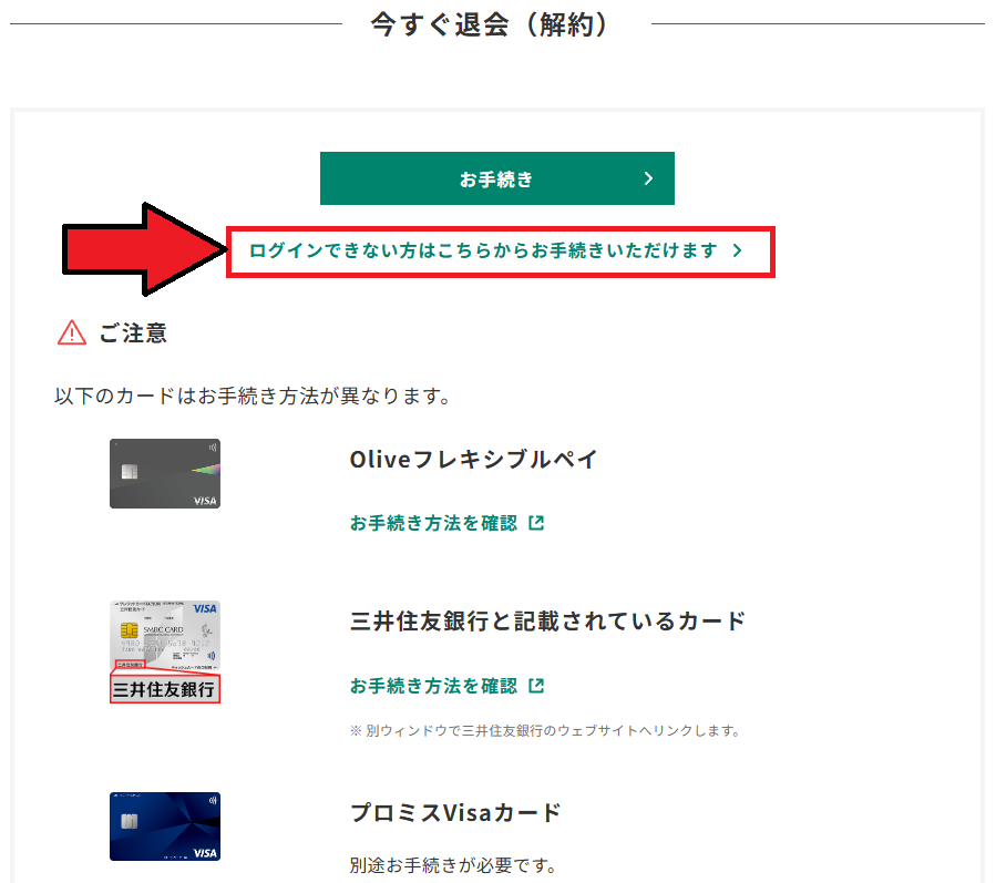 三井住友カードの「カードの退会(解約)」ページへアクセスして、「ログインできない方はこちらからお手続きいただけます」リンクをクリック