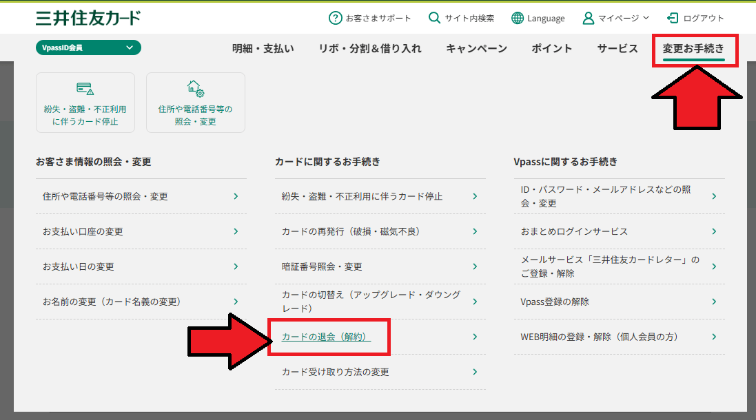 VpassのMyページの右上「変更お手続き」>「カードの退会(解約)」をクリック