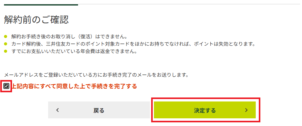 「解約前のご確認」で、「上記内容にすべて同意したうえで手続きを完了する」にチェックを入れて「決定する」をクリック