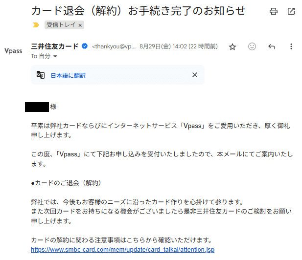 解約手続きが完了すると、即日「カード退会(解約)お手続き完了のお知らせ」メールが届きます。