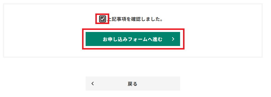 注意事項が確認できたら「上記事項を確認しました」にチェックを入れて「お申し込みフォームへ進む」をクリックします