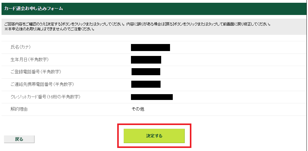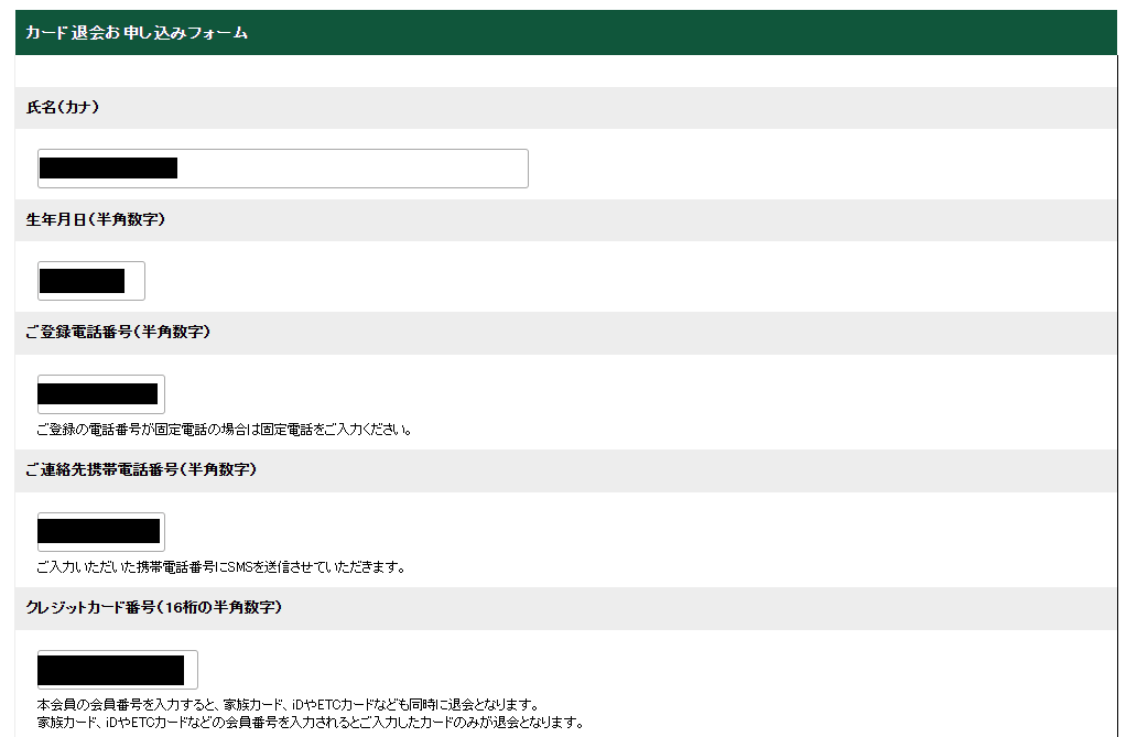 ステップ③:カード解約申し込みフォームへ必要事項入力